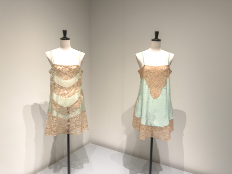 左がマドレーヌ・ヴィオネのデイドレス。ヴィオネは、布を斜めに使うバイアスを用いたドレスを作っていて、個人的に1番好きなデザイナー。久しぶりに見られて嬉しかった。
